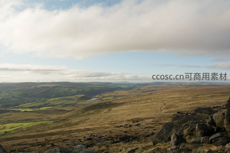 从高处俯瞰,金黄色的高原草地上一条蜿蜒小径通向远方,背景中成排的风力发电机矗立在翠绿的山丘之上,蓝天白云映衬出辽阔的自然风光。