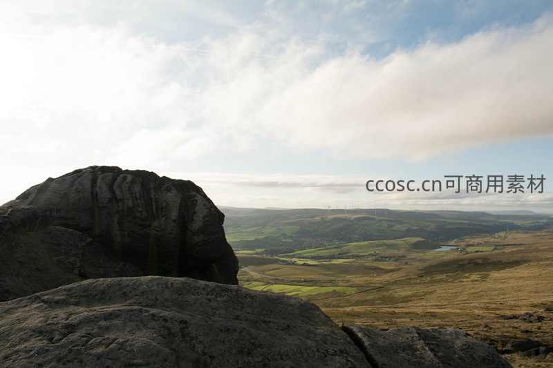 前景中一块巨大岩石形成深色剪影,背景是延展至天际的广阔山谷,点缀着绿色田野和远处的风力发电机,在云层变幻的天空下尽显自然的恢弘与宁静。