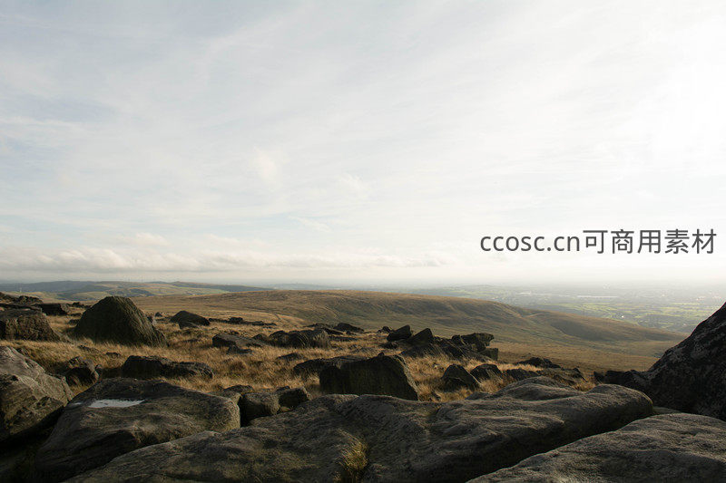 从高处俯瞰,嶙峋的巨石散布在枯黄草地上,远处是连绵起伏的平原和朦胧天际线,展现了大自然的雄浑与宁静。