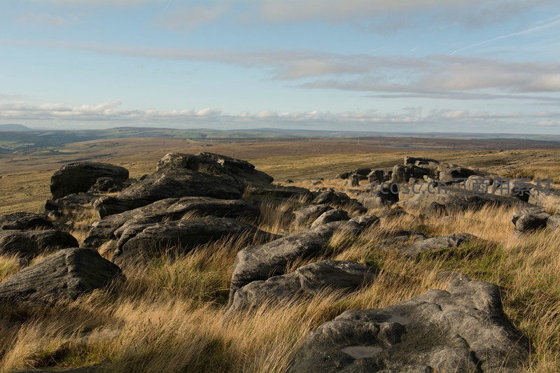 阳光温柔地洒在崎岖的岩石高原上,金黄的草浪随风轻舞,背景是无垠的蓝天与飘逸的云朵,远方山峦层叠,尽显大自然的雄浑与静谧。