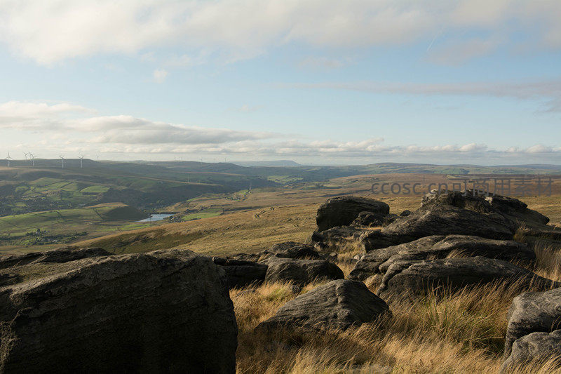 前景是厚重的岩石与枯黄草甸,中景是绿意盎然的山谷与湖泊,远景可见成排风力发电机,现代能源与自然风光和谐共存,视野开阔而富有层次。