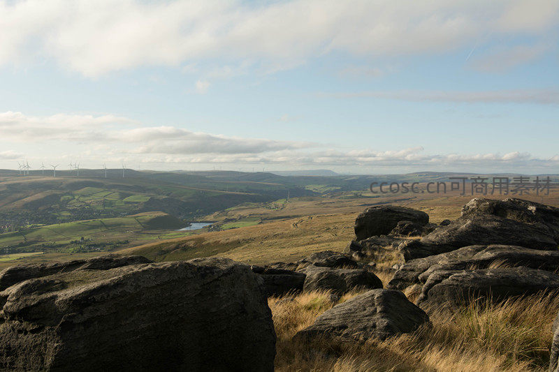 从高处岩石平台俯瞰,下方是错落有致的绿色农田、宁静湖泊与整齐排列的白色风车,蓝天白云下,人与自然和谐共生的田园画卷徐徐展开。