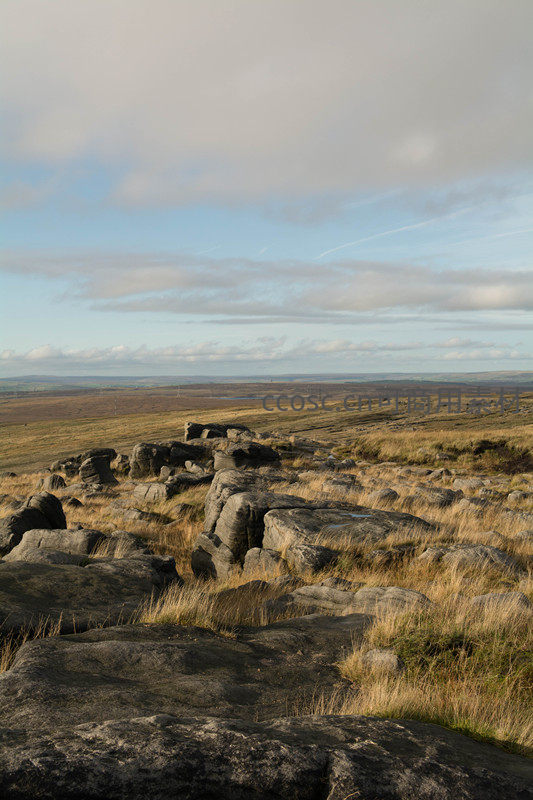 广袤的荒原上散布着巨大的岩石,枯黄的草地延伸至远方,蓝天白云下展现出原始而宁静的自然风光。