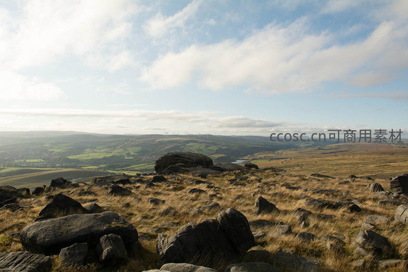 站在高处俯瞰连绵起伏的山谷,远处风力发电机点缀在绿色田野间,近处岩石与干草构成粗犷的地貌纹理。