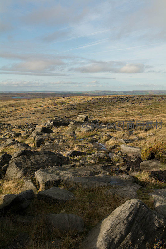 平坦的旷野上布满形态各异的巨大岩石,枯草覆盖其间,远处地平线与蓝天相接,营造出苍茫而壮阔的视觉感受。