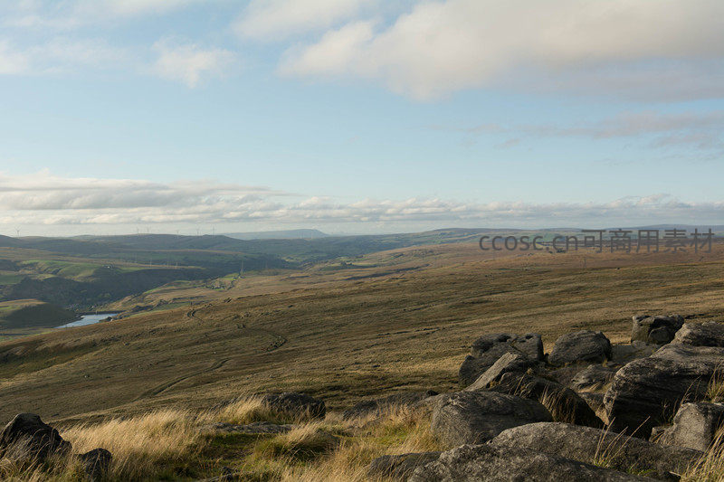 从山顶岩石处向远方眺望,层层叠叠的绿色山丘间点缀着白色风力发电机,一条小河蜿蜒其间,蓝天白云映衬下,尽显田园诗般的宁静与和谐。