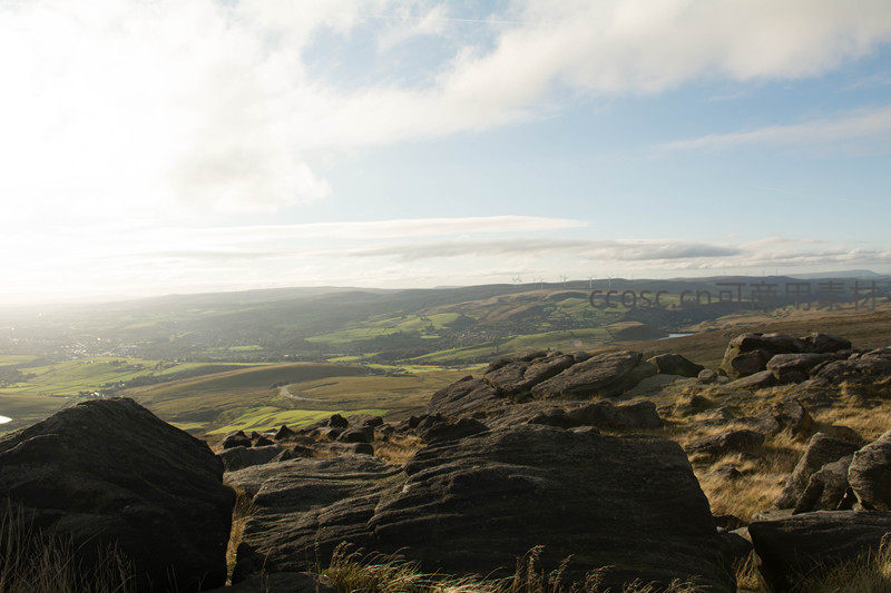 清晨阳光洒在崎岖的高原岩石上,光影交错,远方山谷绿意盎然,点缀着零星村落与风车,天空云卷云舒,营造出辽阔而宁静的自然画卷。