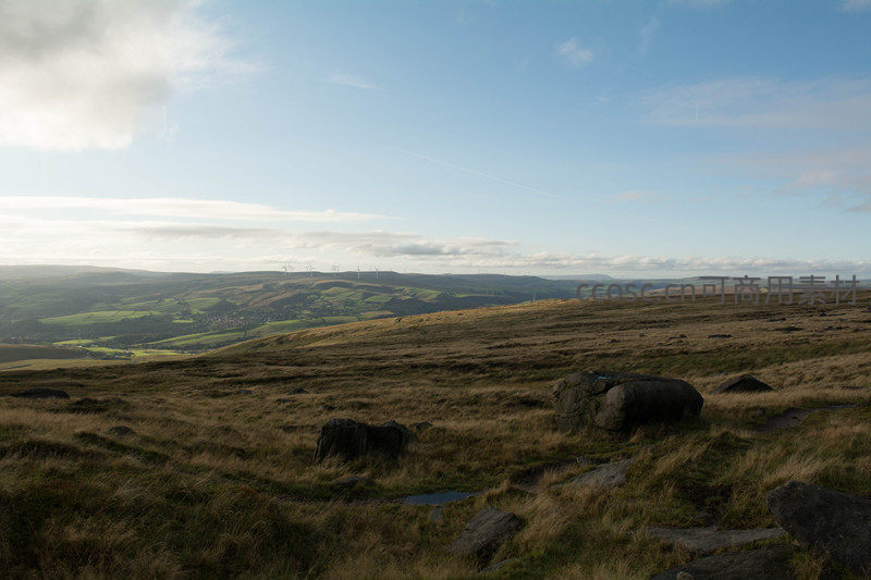 夕阳西下,金色光芒洒满高原旷野,枯草随风轻摇,黑色岩石静静卧于大地,远处山峦上风车缓缓转动,构成一幅宁静又充满力量的生态风景画。