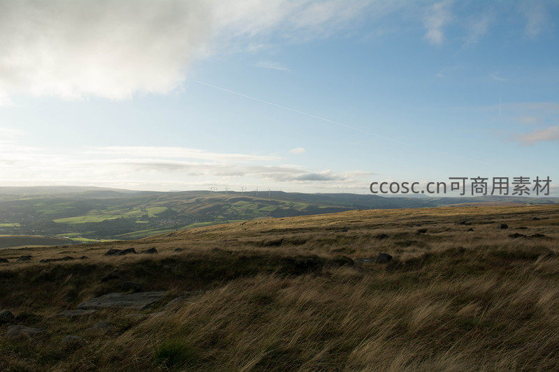 强劲的风拂过起伏的草地,吹动枯黄草浪,远处层叠山峦间隐约可见成排风力发电机,在湛蓝天空下形成人与自然和谐共存的现代生态图景。