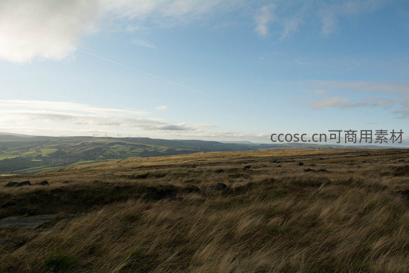 广袤的草原丘陵上,几座风车静静矗立在远方,蓝天白云下,大地辽阔而宁静,充满自然之美。