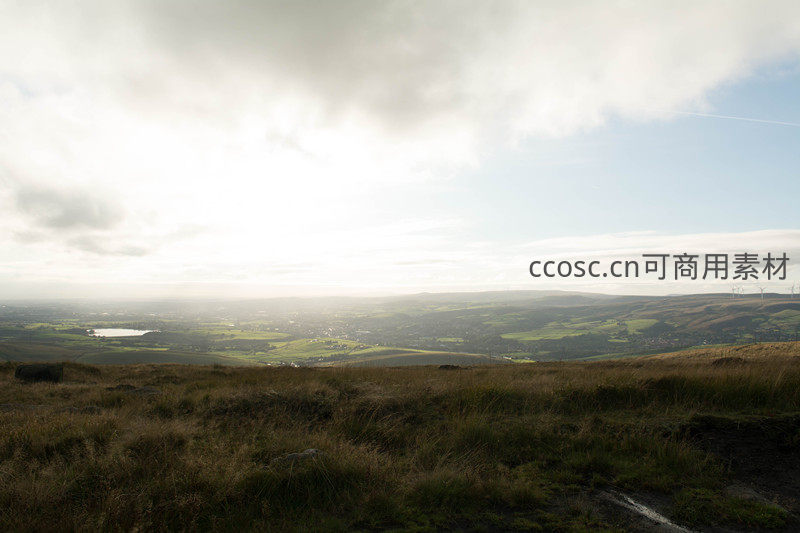 柔和阳光穿透厚重云层,洒落在起伏的山野之上,远处隐约可见风车与村落,光影交错间尽显大自然的壮美。