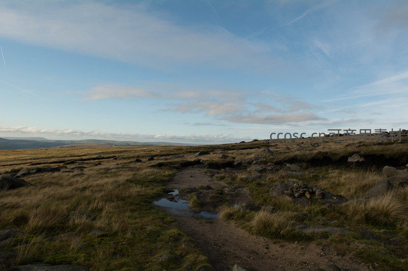 一条蜿蜒的小路穿过布满石块的荒野草地,延伸向远方的地平线,天空湛蓝飘着薄云,是户外徒步的理想场景。