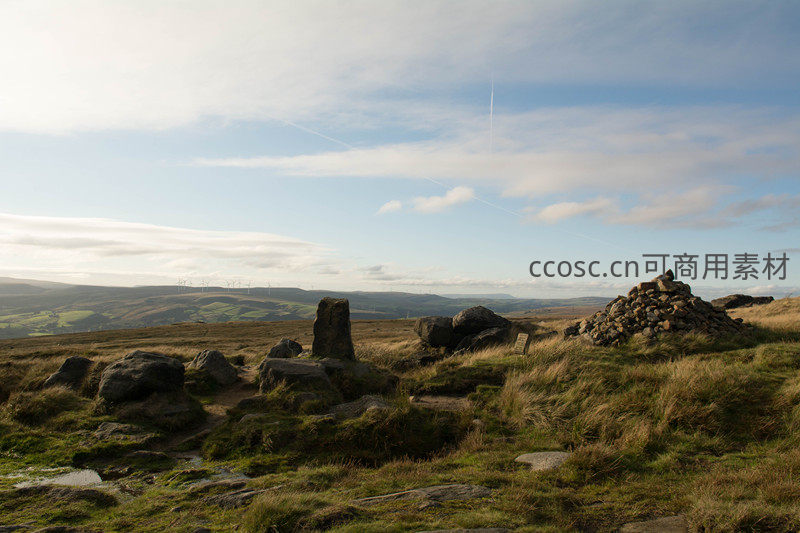 开阔的山野上散布着巨大的岩石和草堆,远处连绵山丘上矗立着一排风力发电机,蓝天白云下显得宁静而壮美。