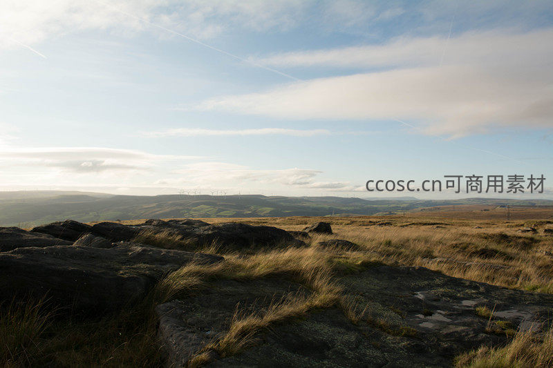 阳光洒在布满岩石和干草的坡地上,视野延伸至远方起伏的绿色山峦,一列风车静静伫立,将自然野趣与清洁能源的现代感完美融合,营造出开阔而平和的氛围。
