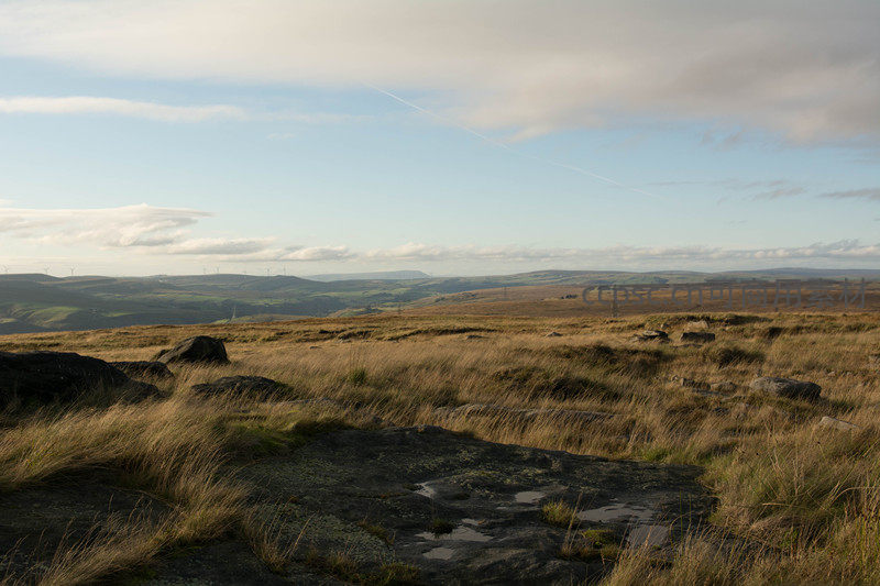 一片苍茫的荒原地貌,地面覆盖着稀疏的枯草和斑驳的岩石,抬头可见万里晴空下几道飞机划过的云痕,远方地平线上风车林立,赋予这片寂静土地以科技与动感的注脚。