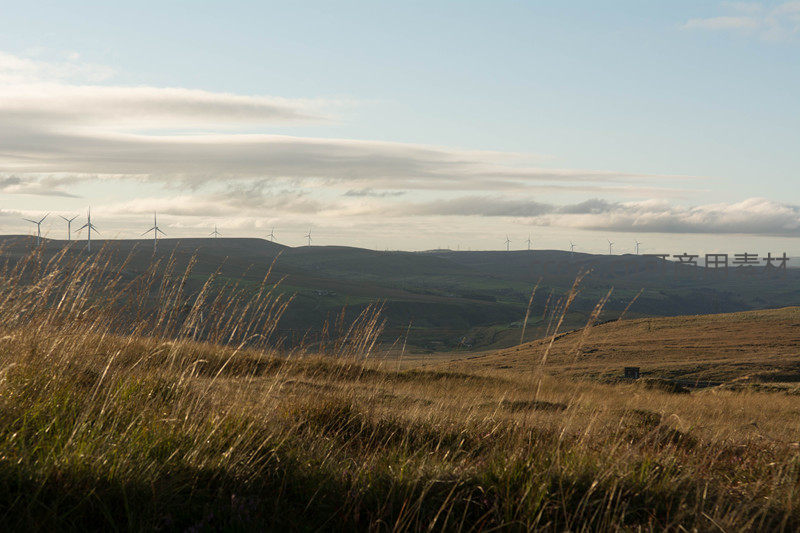 前景摇曳的枯草随风轻舞,背景是连绵山丘上整齐排列的白色风车,蓝天白云下尽显绿色能源与大地的诗意交融。