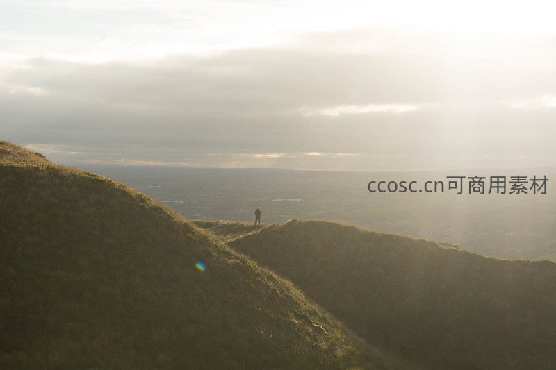 一人伫立山脊之上,背对镜头凝望远方城市轮廓,夕阳洒下金辉,身影渺小却坚定,诠释人与自然的沉思对话。