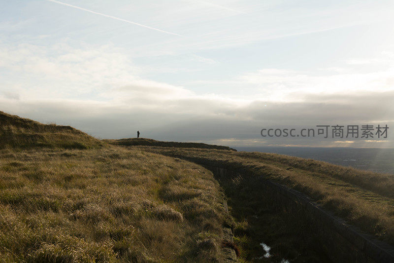 草坡远眺:云隙光洒向孤独旅人