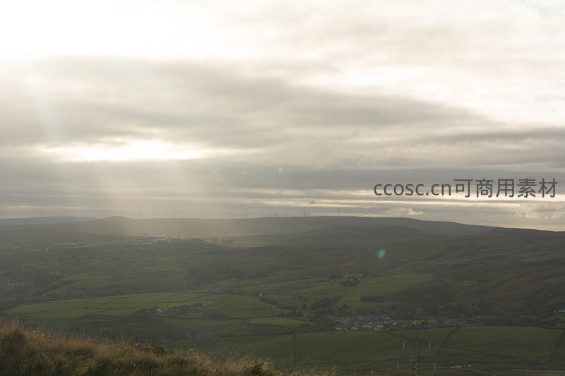 从高处俯瞰,层层叠叠的绿色田野铺展至远方,点缀着几座风力发电机。厚重云层中透出的光束为这片宁静乡村增添了神圣与希望。
