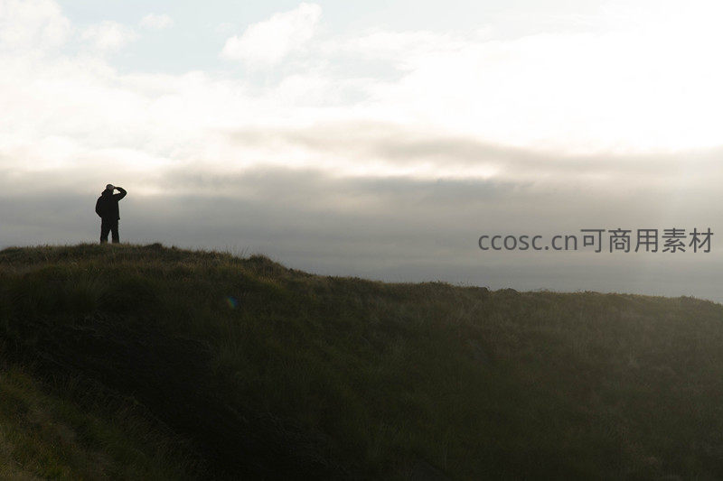 一个孤独的身影站在山巅,手搭额头远眺无垠云海。逆光勾勒出清晰轮廓,传达出对远方的向往、对自然的敬畏以及内心的沉静思索。