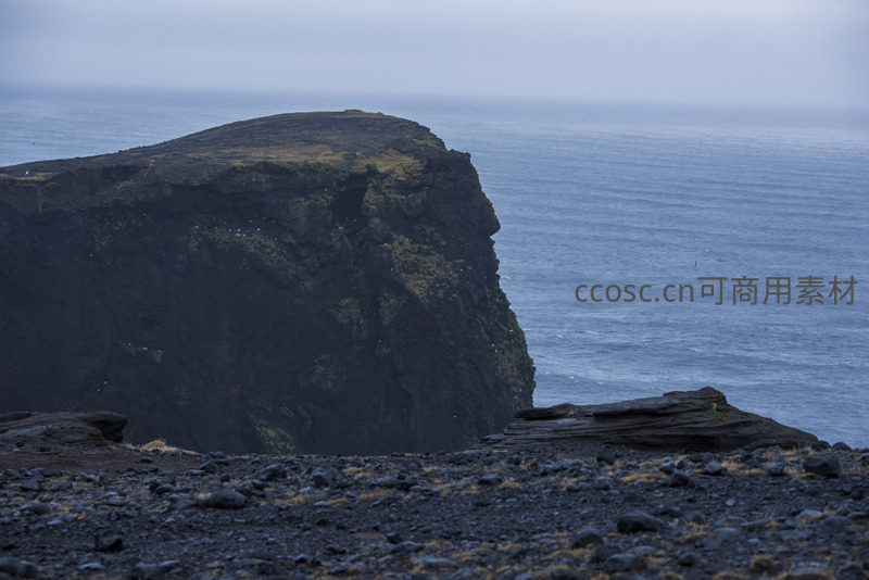 陡峭的黑色玄武岩悬崖矗立于海边,顶部覆盖着稀疏的苔藓与地衣,海风凛冽,远处海面辽阔无垠,展现出原始而壮丽的自然景象。