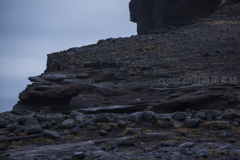 近距离拍摄的火山岩层理结构清晰可见,深褐色与灰色岩层交错堆叠,表面散布着碎石和零星苔藓,在阴沉天光下更显粗犷质感与地质历史的厚重。