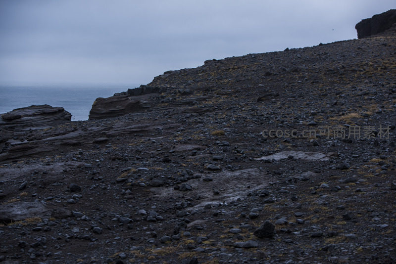 灰暗天空下,黑色火山岩覆盖的海岸线延伸至远方,海浪轻拍,展现出原始而苍凉的自然之美。