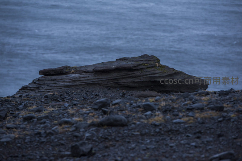 在暮色笼罩下,黑色玄武岩层静静矗立于海岸边,层层纹理诉说着地质变迁,远处海浪轻拍,营造出宁静而苍凉的自然氛围。