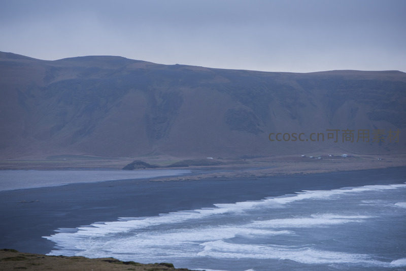 绵延的黑沙滩被白色浪花温柔拥抱,远处山峦轮廓柔和,几处房屋点缀其间,构成一幅宁静、辽阔且略带孤寂感的海岸全景画卷。