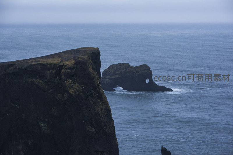 高耸的苔藓覆盖悬崖与远处被海浪环绕的独立岩礁遥相呼应,构成一幅充满力量感和空间纵深的海景图。