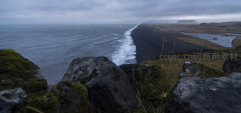 灰云笼罩下,深色火山砂砾铺就的海滩与翻涌白浪相接,远处山峦隐约,构成一幅冷峻而壮阔的自然画卷。
