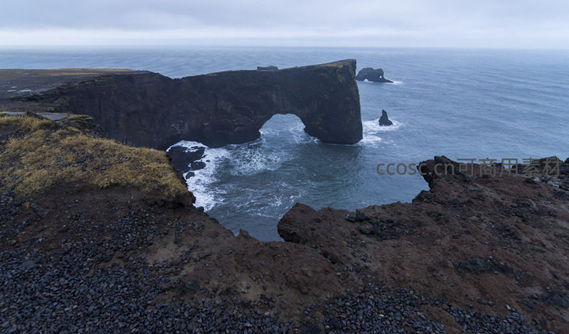 巨大的天然岩石拱门在波涛中屹立,海水从拱洞中穿过,周围是崎岖的火山地貌和翻滚的浪花,尽显大自然鬼斧神工。