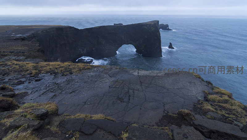 前景是龟裂的黑色熔岩台地,远处壮观的海蚀拱门在雾气中若隐若现,展现了冰岛独特而原始的火山海岸风貌。