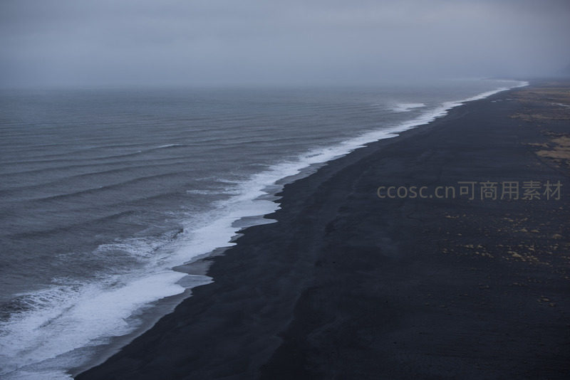灰蒙天空下,深色火山沙与白色浪花形成强烈对比,海岸线绵延至远方,展现原始而壮阔的自然之美。