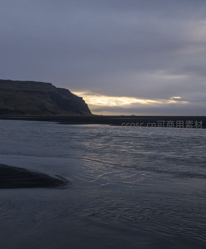 细密水波轻柔地漫过黑色滩涂,远处山崖在暮色中若隐若现,整个画面充满流动感与沉静的诗意。