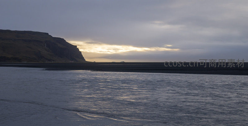 夕阳西下,金色余晖穿透云层洒在平静海面上,远处山崖轮廓分明,黑沙滩蜿蜒延伸,营造出静谧而壮阔的自然画卷。