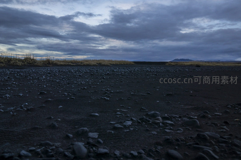 在黄昏的微光中,广袤的黑色火山沙砾铺展至天际,远处山峦轮廓在厚重云层下若隐若现,营造出苍凉而宁静的北欧自然意境。
