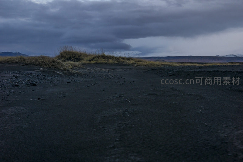 一片被火山灰覆盖的平原延伸向远方,稀疏的草丛顽强生长,头顶是翻滚的风暴云团,整体色调沉郁,传递出大自然的粗犷与孤寂感。