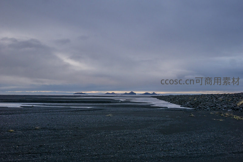 退潮后的黑色沙滩上,浅浅水道如银带般蜿蜒曲折,远处岛屿剪影在灰蓝色天空下清晰可见,构成一幅静谧而富有层次的海岸线画卷。