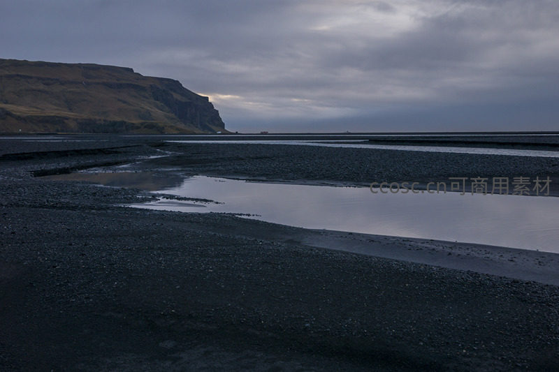 在阴沉的天空下,黑色的火山砂砾滩涂延伸至远方,平静的水洼倒映着天光,远处陡峭的山崖轮廓分明,营造出一种苍凉而宁静的氛围。