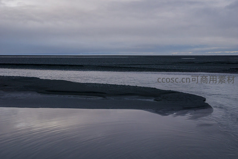 一片开阔的海岸,浅水区如镜面般倒映着灰白的天空,深色的沙洲在水中形成柔和的曲线,天地相接处空旷无垠,传递出一种孤独而宏大的美感。