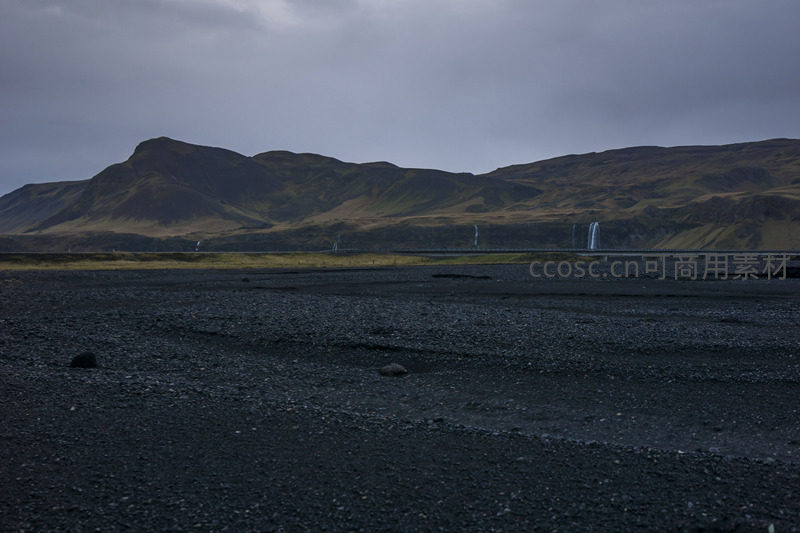广袤的黑色火山熔岩平原上,一座现代化的公路桥横跨其间,背景是连绵起伏的绿色山丘,展现了原始自然景观与人类工程奇迹的和谐共存。
