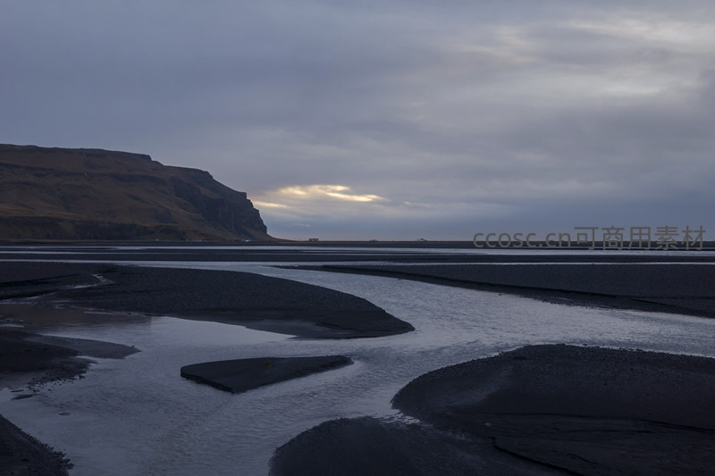 河流如银带般穿梭于广袤的黑色沙原之上,将大地温柔分割,远处悬崖巍峨耸立,天空云层低垂,整个场景宛如一幅冷色调的自然画卷。