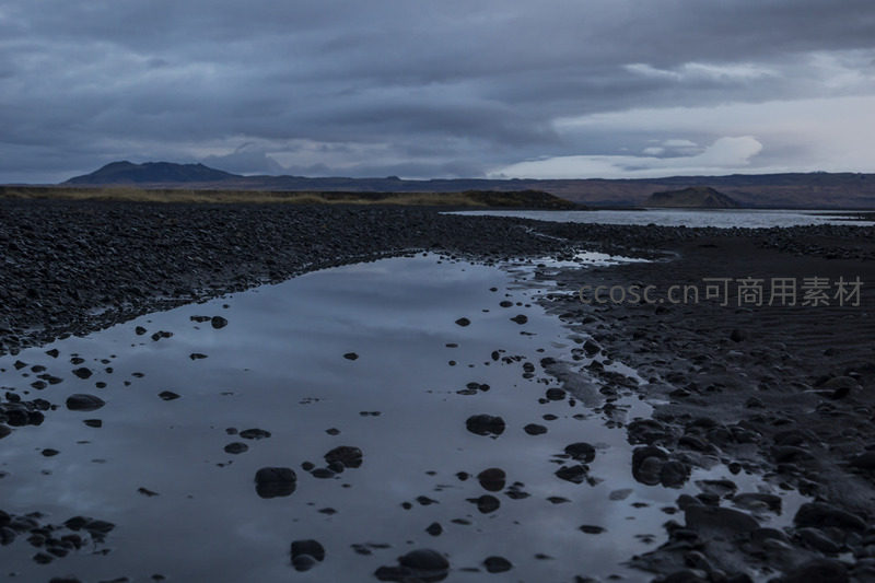 低角度拍摄的湿地区域,黑色卵石与积水形成完美倒影,天空云层厚重,整体画面沉静而富有层次感。