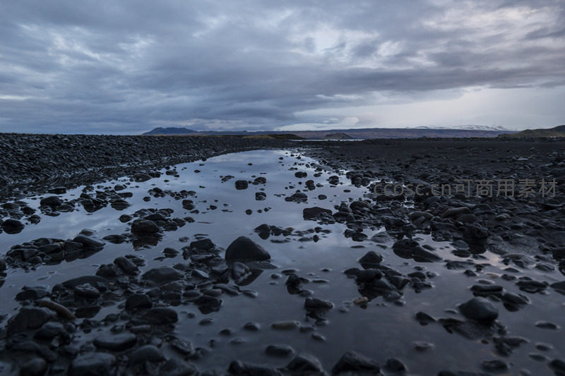 水流缓缓穿过布满黑色火山岩的河床,水面映照着阴沉天空,展现出原始地貌中蕴含的自然韵律与美感。