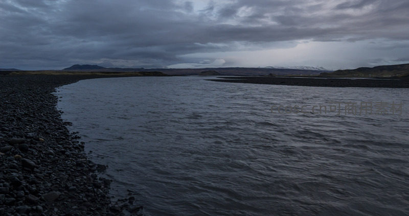 河水沿着深色砾石滩缓缓流淌,两岸地势起伏,远处山脉轮廓在乌云下若隐若现,构成一幅苍茫壮丽的自然画卷。