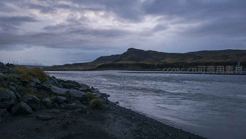 黄昏时分,冰岛河谷被柔和的暮色笼罩,远山连绵起伏,近处河水静静流淌,岸边黑色火山岩与稀疏草甸相映成趣,天空云层厚重而富有层次。