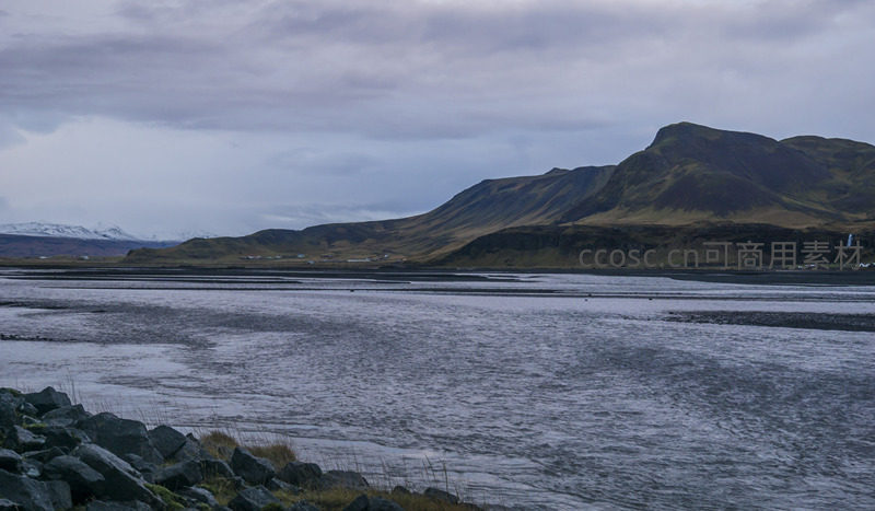 画面中群山巍峨,覆盖着深绿与棕褐的植被,前方宽阔的河面平静如镜,清晰倒映着天空与山峦轮廓,前景散落着火山岩块,整体氛围沉静而壮美。