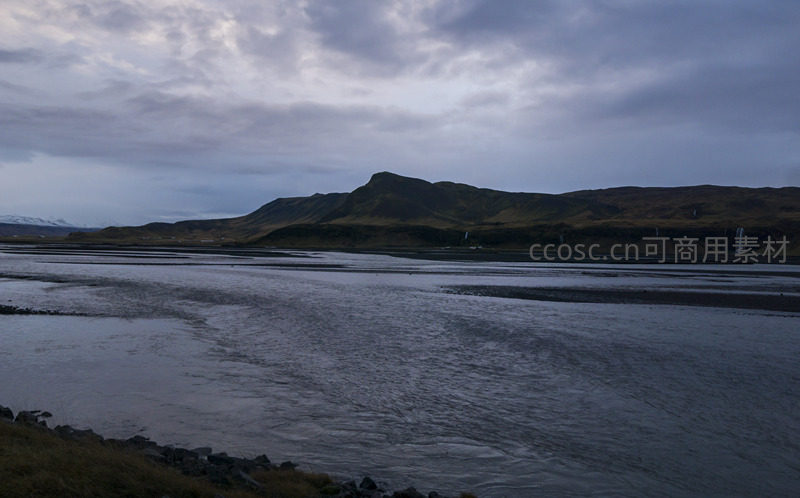 在昏暗的光线下,河流缓缓穿过河谷,远方山峦呈现出深色剪影,河床纹理清晰可见,近处草坡与岩石形成对比,整个画面充满静谧与原始的自然力量。