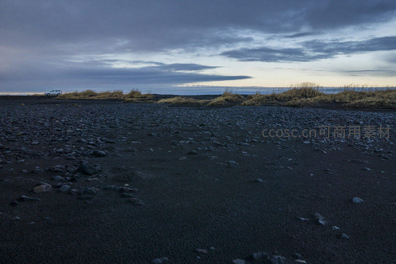 一辆白色越野车停驻在无垠的黑色沙砾平原边缘,枯黄草丛随风摇曳,天边霞光微露,厚重云层压顶,画面充满末世感与探索未知的孤寂气息。